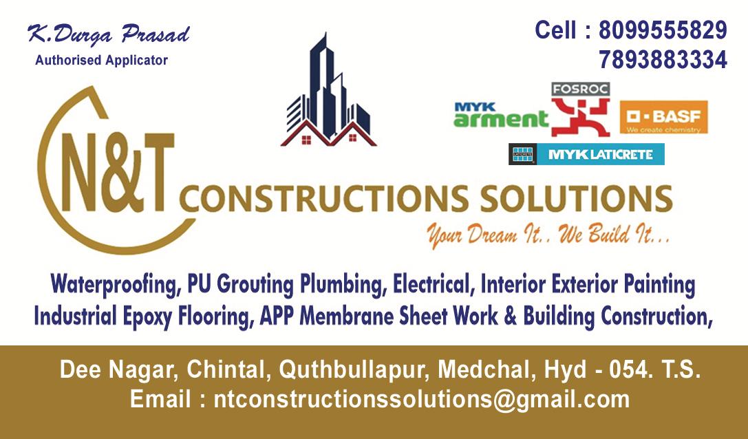 Solutions N&T Construction Solutions in Hyderabad is one of the leading businesses in the Waterproofing Contractors. Also known for Waterproofing Contractors, Waterproofing Contractors For Water Tank, Waterproofing Contractors For Terrace, Waterproofing Contractors For Roof, Waterproofing Contractors For Bathroom, Waterproofing Contractors For Wall, Waterproofing Contractors For Basement, Waterproofing Contractors For Floor and much more.